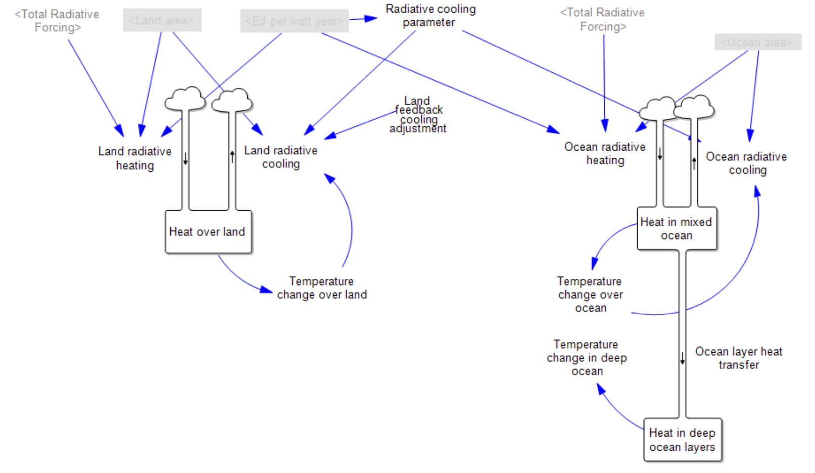 $$ \begin{align} T_\mathrm{land} &= \frac{Q_\mathrm{land}}{R_\mathrm{land}} \\[4pt] T_\mathrm{surf} &= \frac{Q_\mathrm{surf}}{R_\mathrm{surf}} \\[4pt] T_\mathrm{deep} &= \frac{Q_\mathrm{deep}}{R_\mathrm{deep}} \\[4pt] Q_\mathrm{land} &= \int (RF(t) - F_\mathrm{out}(t))\,dt + Q_\mathrm{land}(0) \\[4pt] Q_\mathrm{surf} &= \int (RF(t) - F_\mathrm{out}(t) - F_\mathrm{deep}(t))\,dt + Q_\mathrm{surf}(0) \\[4pt] Q_\mathrm{deep} &= \int F_\mathrm{deep}(t)\,dt + Q_\mathrm{deep}(0) \end{align} $$