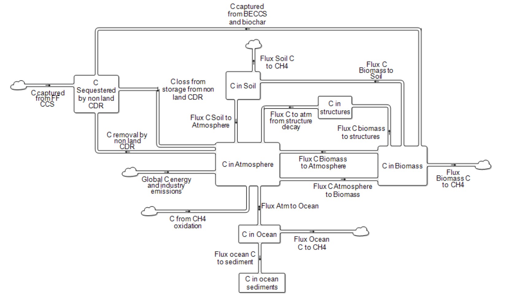 The sum of carbon removals by non-land based CDR, defined in Carbon Dioxide Removal, is another flux from the carbon in the atmosphere, which increases the stock of carbon sequestered. Carbon captured from CCS also increases that stock. The sum of carbon from that stock that is lost re-enters the atmosphere.