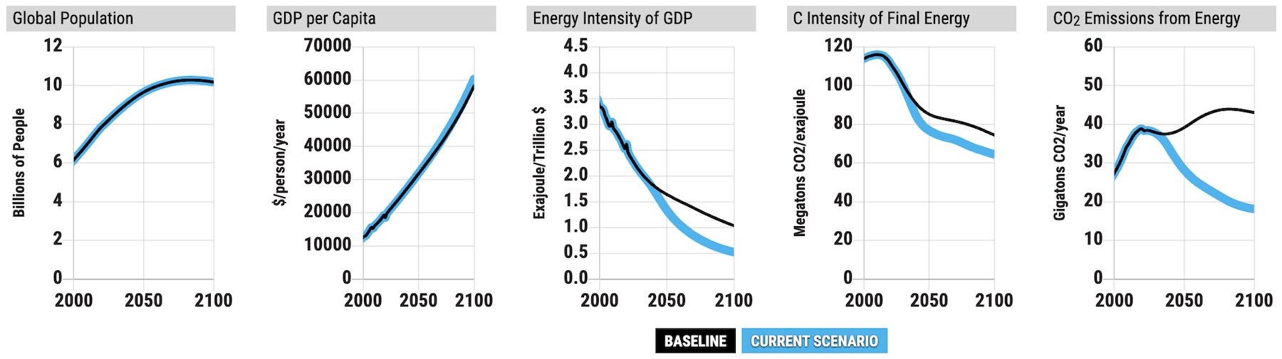 Pro ilustraci tohoto bodu: Viz níže uvedený pohled na grafy Kaya pro scénář s nízkými emisemi se zvýšenou energetickou účinností a přechodem na nízkouhlíkové zdroje energie. I když se energetická náročnost HDP zlepšuje a uhlíková náročnost energie také klesá, celosvětová populace a HDP na osobu nadále rostou.