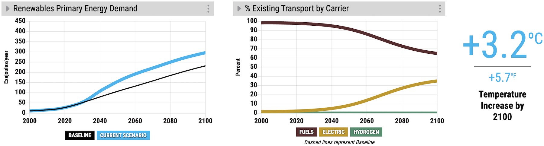 Obnovitelné zdroje, jaderná energie a nová bezuhlíková energie vyrábějí energii ve formě elektřiny v En-ROADS. Budovy, průmysl a doprava musí být schopny využívat elektřinu, aby mohly využívat tyto čistší zdroje energie. Elektrifikace budov a průmyslu (například přechodem na elektrická tepelná čerpadla) a dopravy (přechod ze spalovacích motorů na elektrická vozidla) je proto pro změnu energetického mixu nezbytná. Všimněte si v En-ROADS, jak výrazné dotování obnovitelných zdrojů vede ke snížení teploty o 0,1 stupně Celsia: