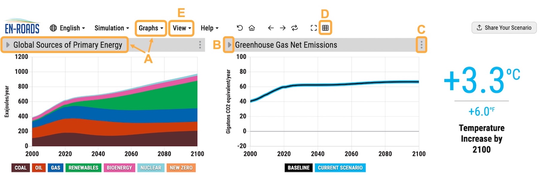 - Select graphs – When you first open En-ROADS, you see the two default graphs. You can select from the full list of graphs by clicking the title of the left or right graph. You can also select from the Graphs menu from the top toolbar.