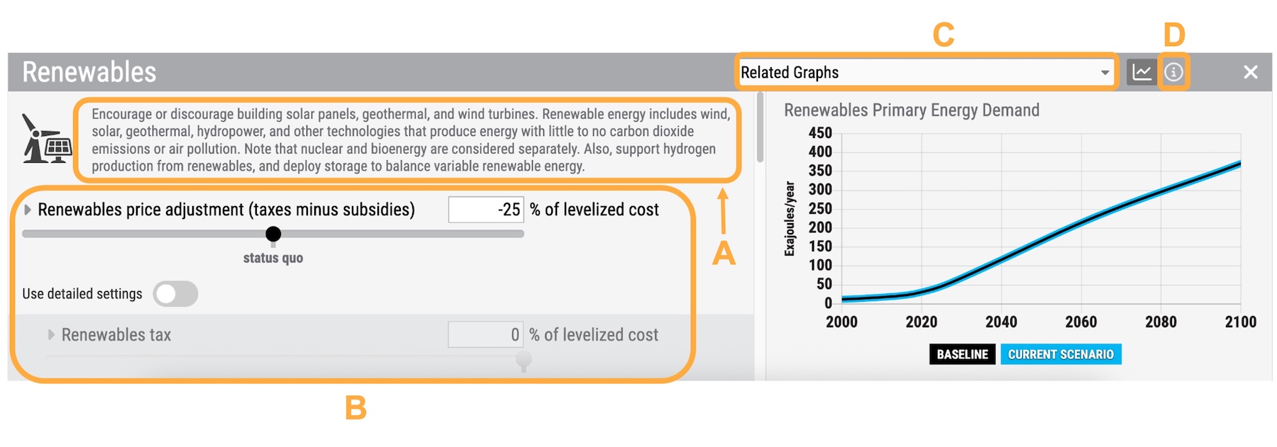 D. Aiuto - È possibile accedere a informazioni più dettagliate sul dispositivo di scorrimento tramite il pulsante delle informazioni. Si tratta delle stesse informazioni che si trovano per questo argomento nella Guida per l'utente di En-ROADS.
