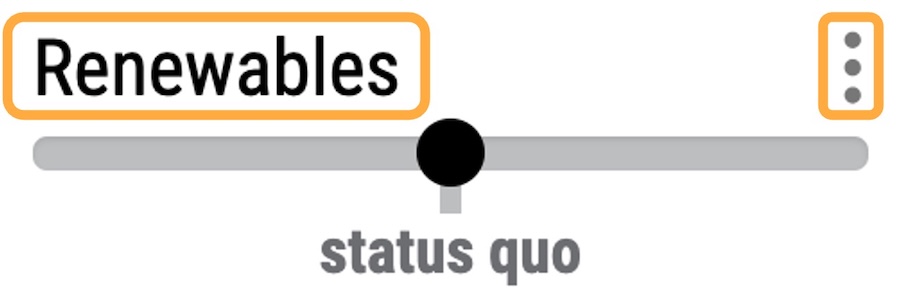 Det er 19 skyveknapper som representerer forskjellige handlinger du kan teste i En-ROADS-simulatoren. Klikk tittelen på skyveknappen eller de tre prikkene til høyre for hver skyveknapp for å få tilgang til detaljerte skyveknapp-innstillinger: